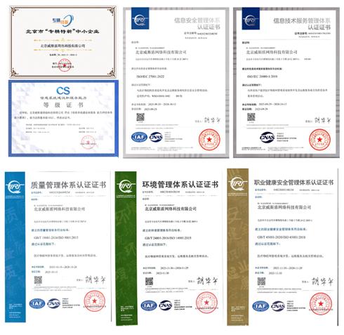 资质是企业实力的硬核背书,更是市场信任的重要凭证。过去一年,公司将资质申报与体系完善作为向内深耕的首要抓手,组建专业团队学习、打磨与严苛的审核,除再次获得国家级高新技术企业、信息系统建设和服务能力二级认证及北京市专精特新中小企业认证外,还通过了ISO9001 、ISO14001 、ISO45001 、IEC27001 、IEC20000-1等多项体系认证,每一项荣誉的背后,都是公司对流程规范的极致追求,对服务品质的坚定承诺。这些资质让我们在市场竞争中具备了更强劲的底气,为客户提供更可靠、更专业的解决方案奠定了坚实基础。未来,公司将持续以资质认证为牵引,不断优化管理体系,筑牢企业高质量发展的“护城河”。